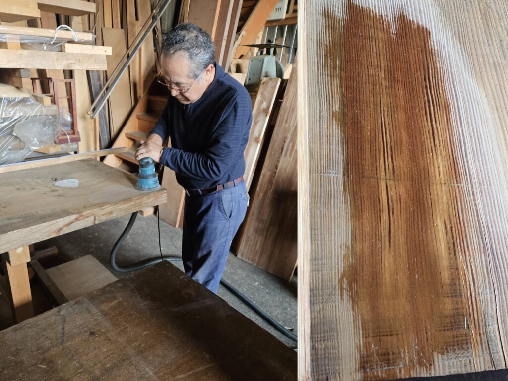 現状では色や模様がグレーがかり変色てしまっていたので、表面を磨いていただきオイルを塗ると、、、見事な木目と色合いを見せてくれました。